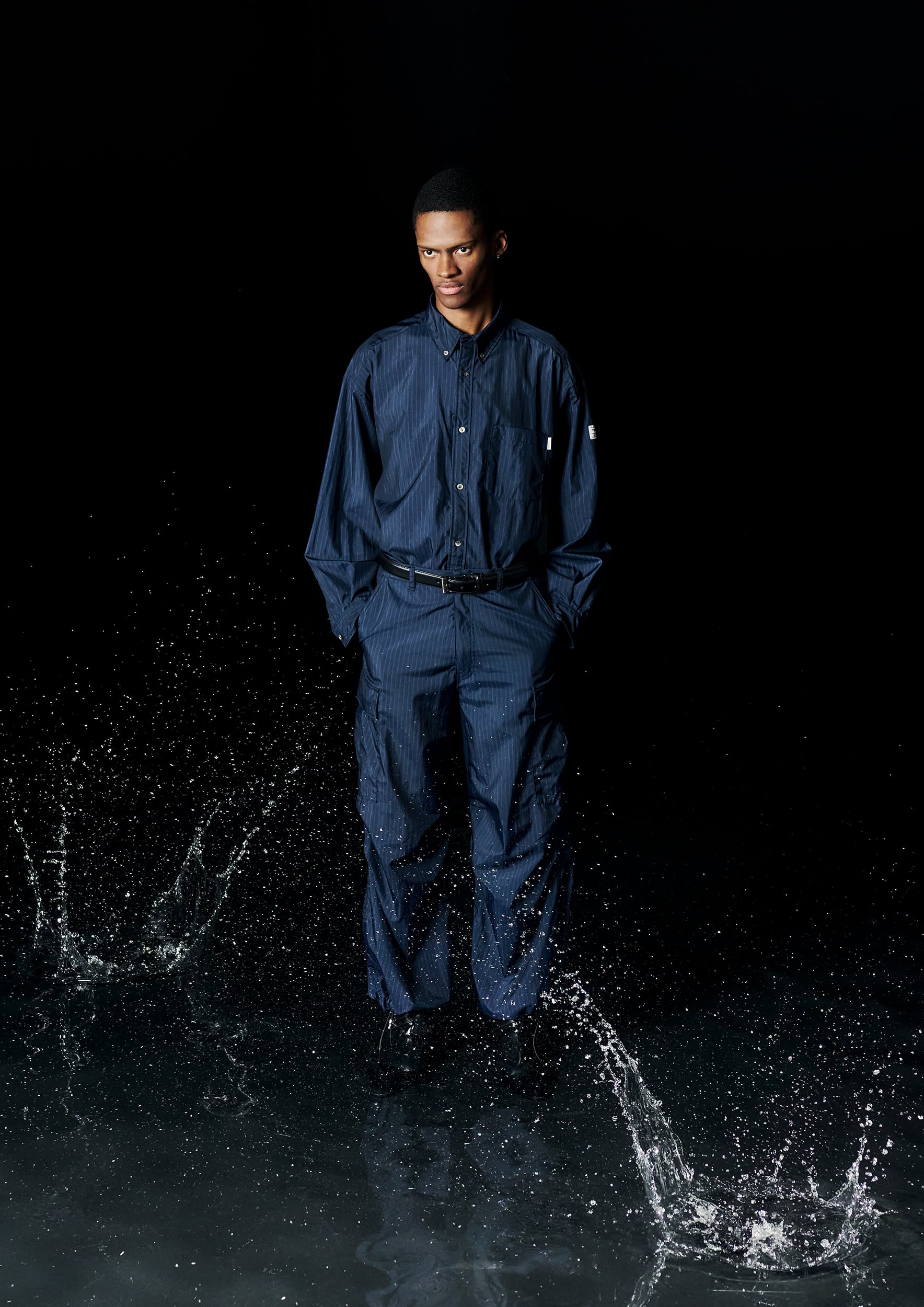 撥水機能のあるワッシャーナイロン生地を使用した超ワイドシルエットのボタンダウンシャツ。