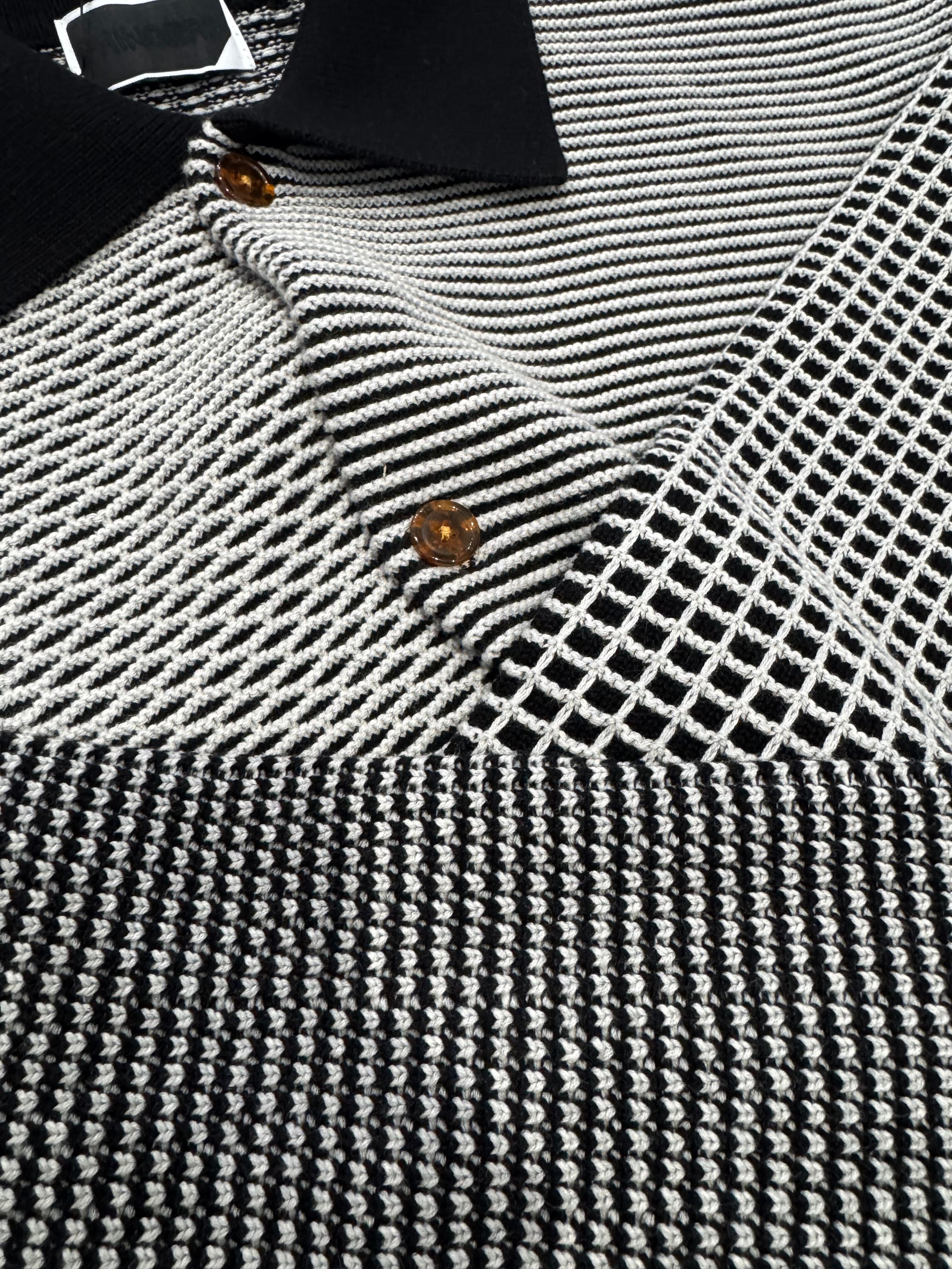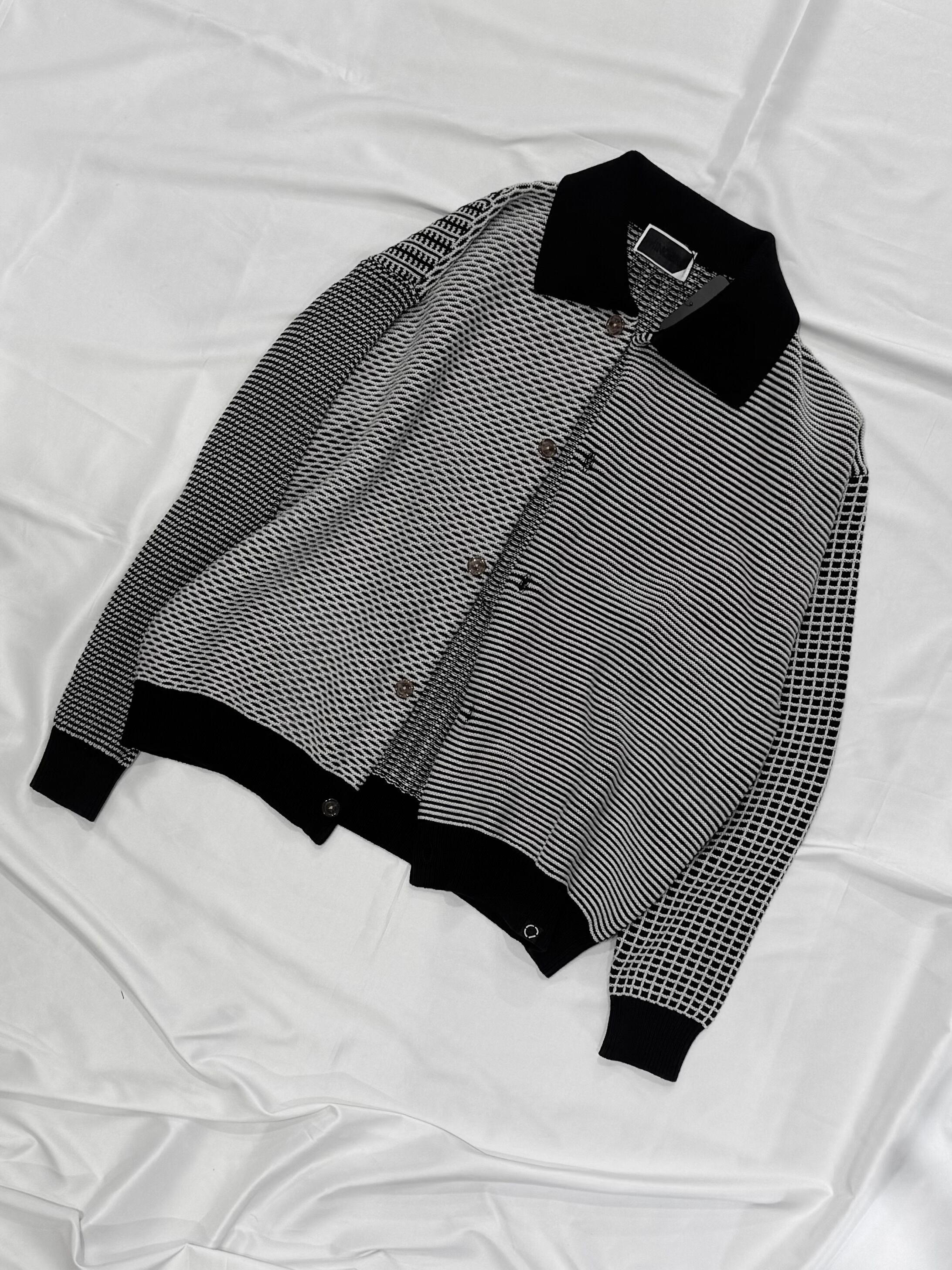 同糸で網目の違うニット地をパネルごとで切り替えたニットシャツ、カジュアルにアルチザンな雰囲気を演出しています
