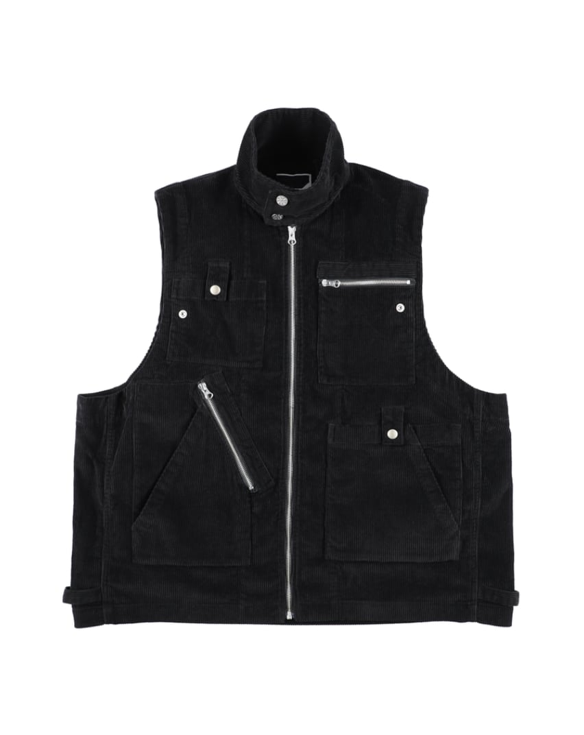 トップジャケットを開けたときにチラッと見える、ベストのユーティリティディーテールや、同素材の中の重なりの中での、ボタンとファスナーのコントラストもクールなデザイン◎