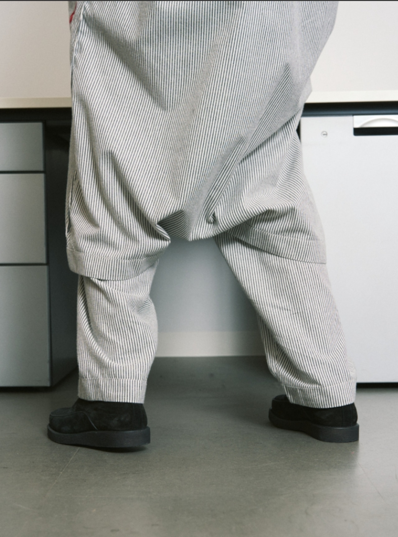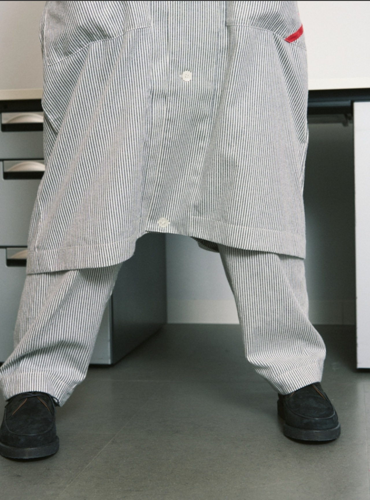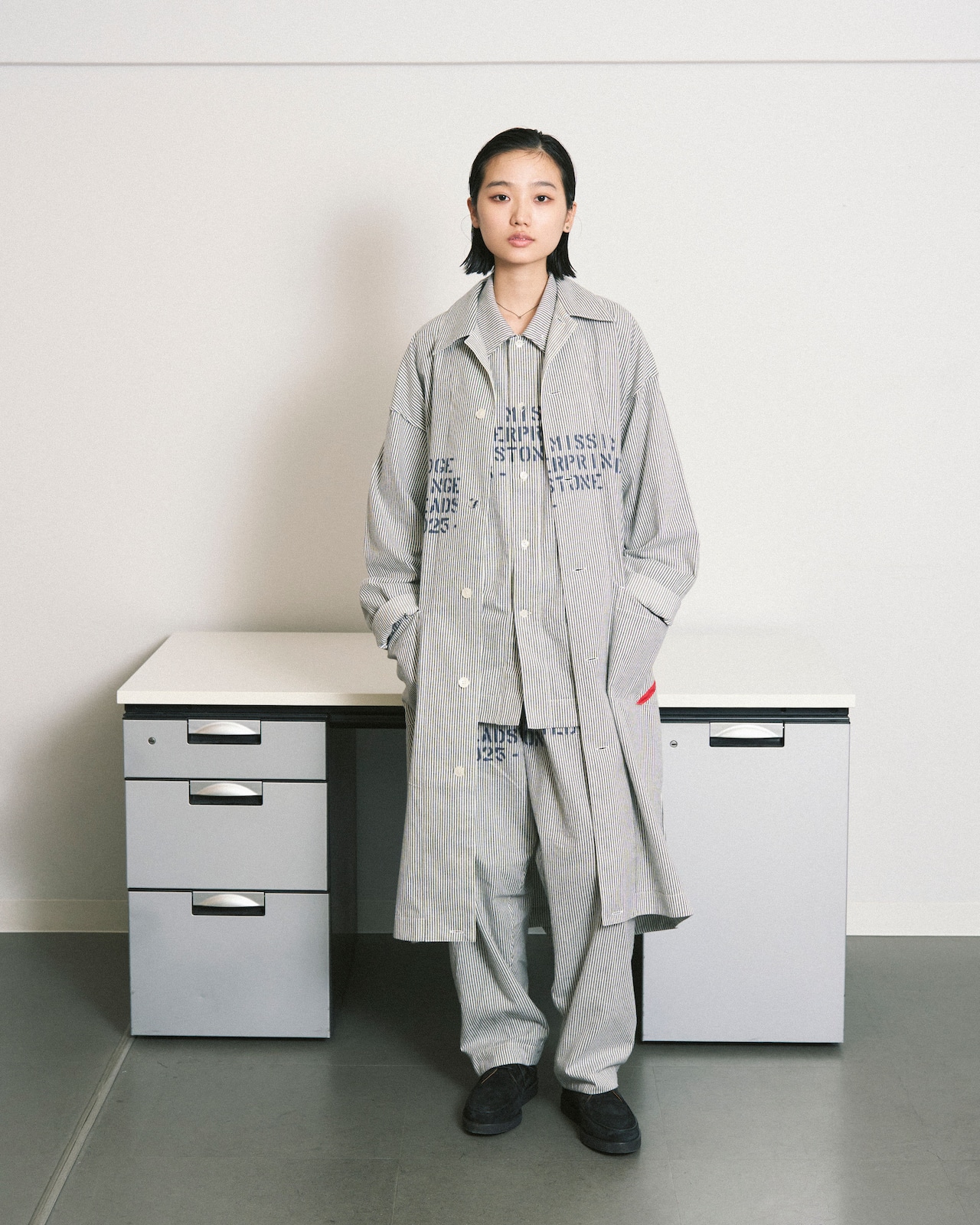 ストローク、 ポケット形、蓄光ハートボタンなど、PHINGERINのデザインステートメントが詰まったオリジナルパジャマスリーパー、少しコージーな雰囲気のスモーキーなストライプ生地です