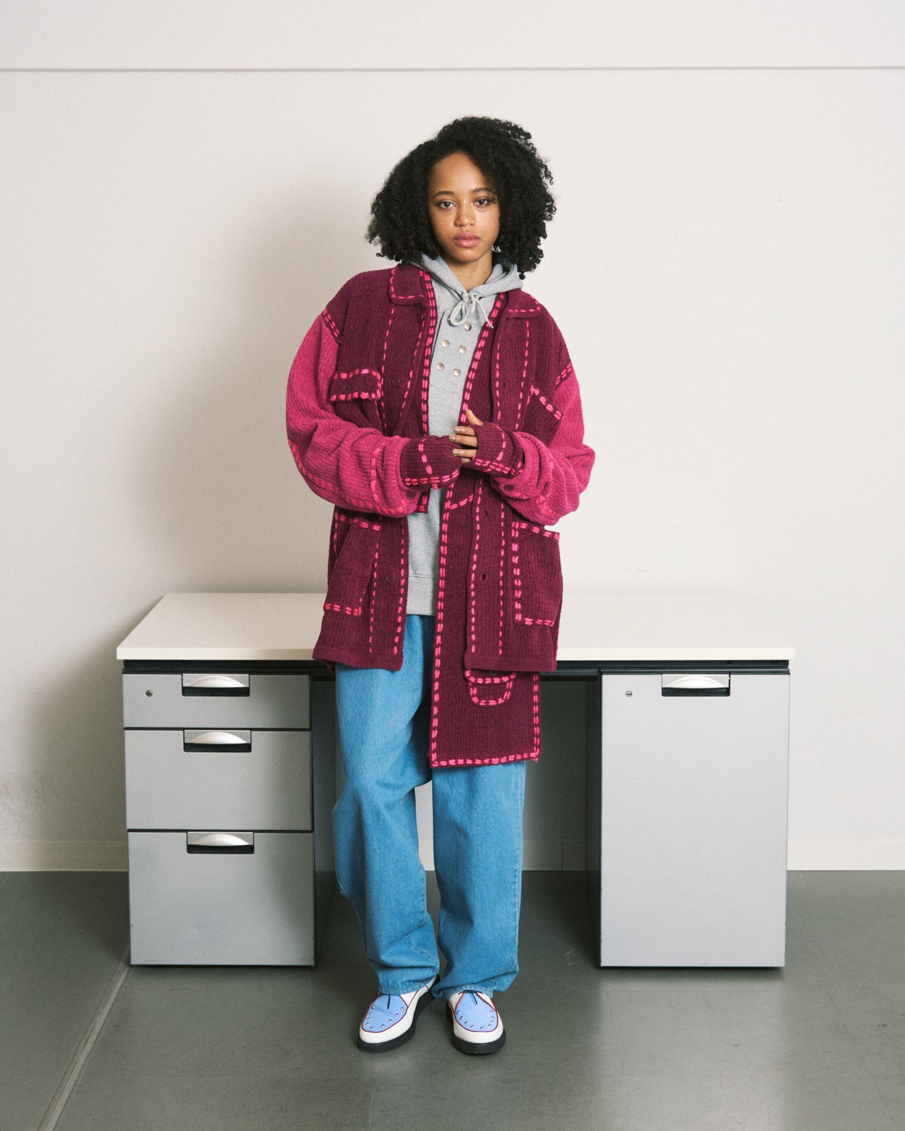 スクエアなイメージのあるユーティリティアイテムを、文字通り柔らかい雰囲気で表現したユーモラスなカーディガンです。