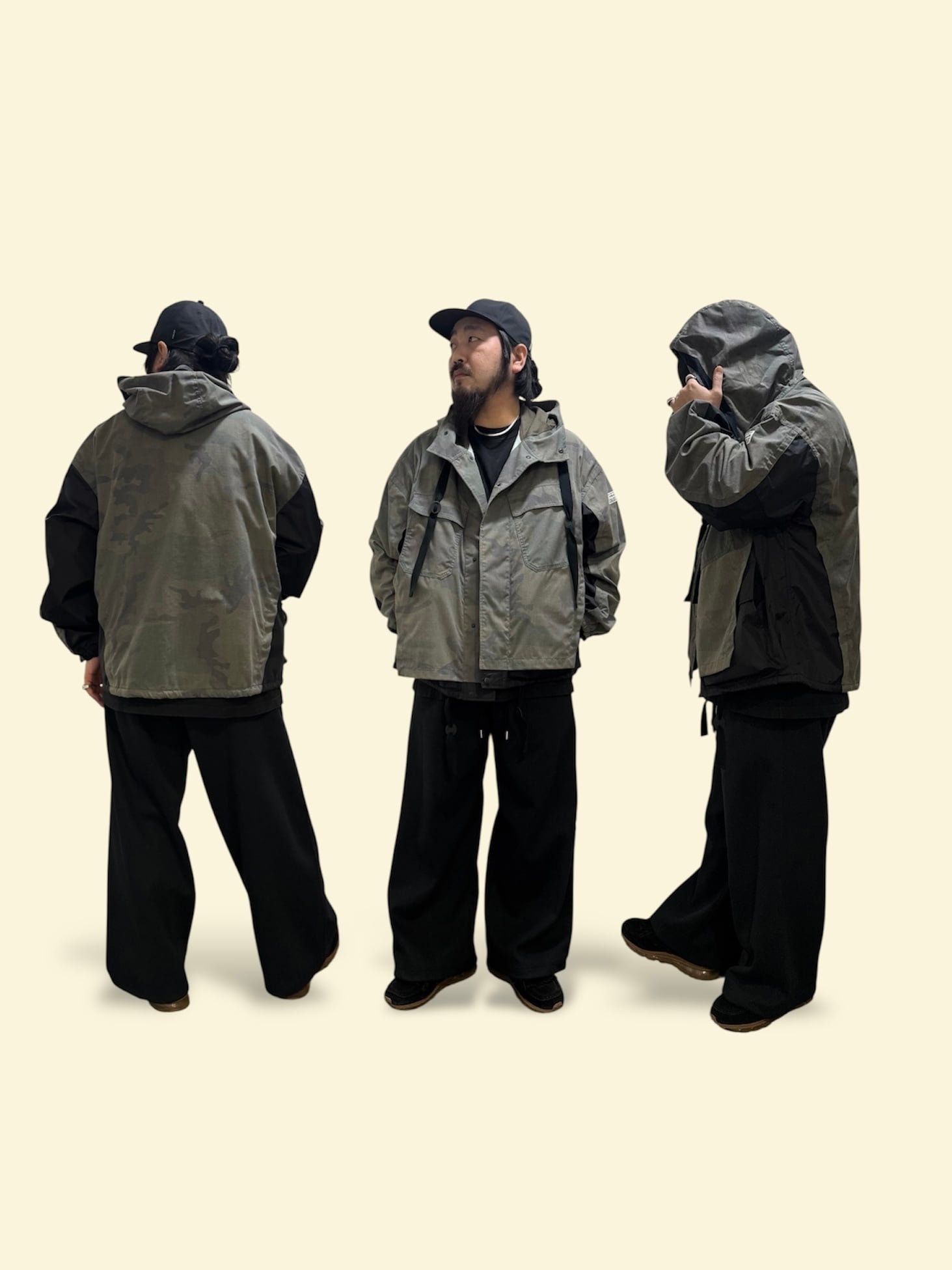 ミリタリー要素を軸に 色、素材、サイジングなどで変化を持たせ、やわらかさのある服。