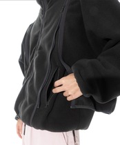 肩線から着脱するものではなく、前身頃に間隔に入ったファスナーを広げる事で、左身頃端から肩~袖丸ごと脱着できる仕様。